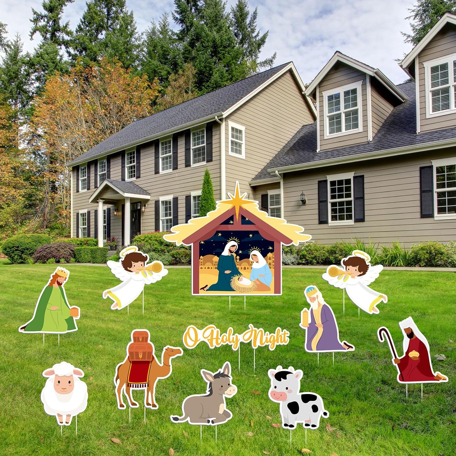 Holy Nativity Yard Decorations: Create a festive and meaningful outdoor display with these religious Christmas yard signs. The set includes 11 different designs, featuring a manger scene, angels, cow, sheep, wise men, camel, donkey, and a sign with the words "O Holy Night." Stakes are included for easy and secure displaying in your yard.