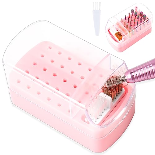 2 in 1 Nail Drill Bits Holder & Nail Drill Bits Cleaning Brush Case,30 Holes Dustproof Nail Art Drill Bits Stand Display Storage Box and Nail Drill Bits Cleaner Manicure Tools (Pink)