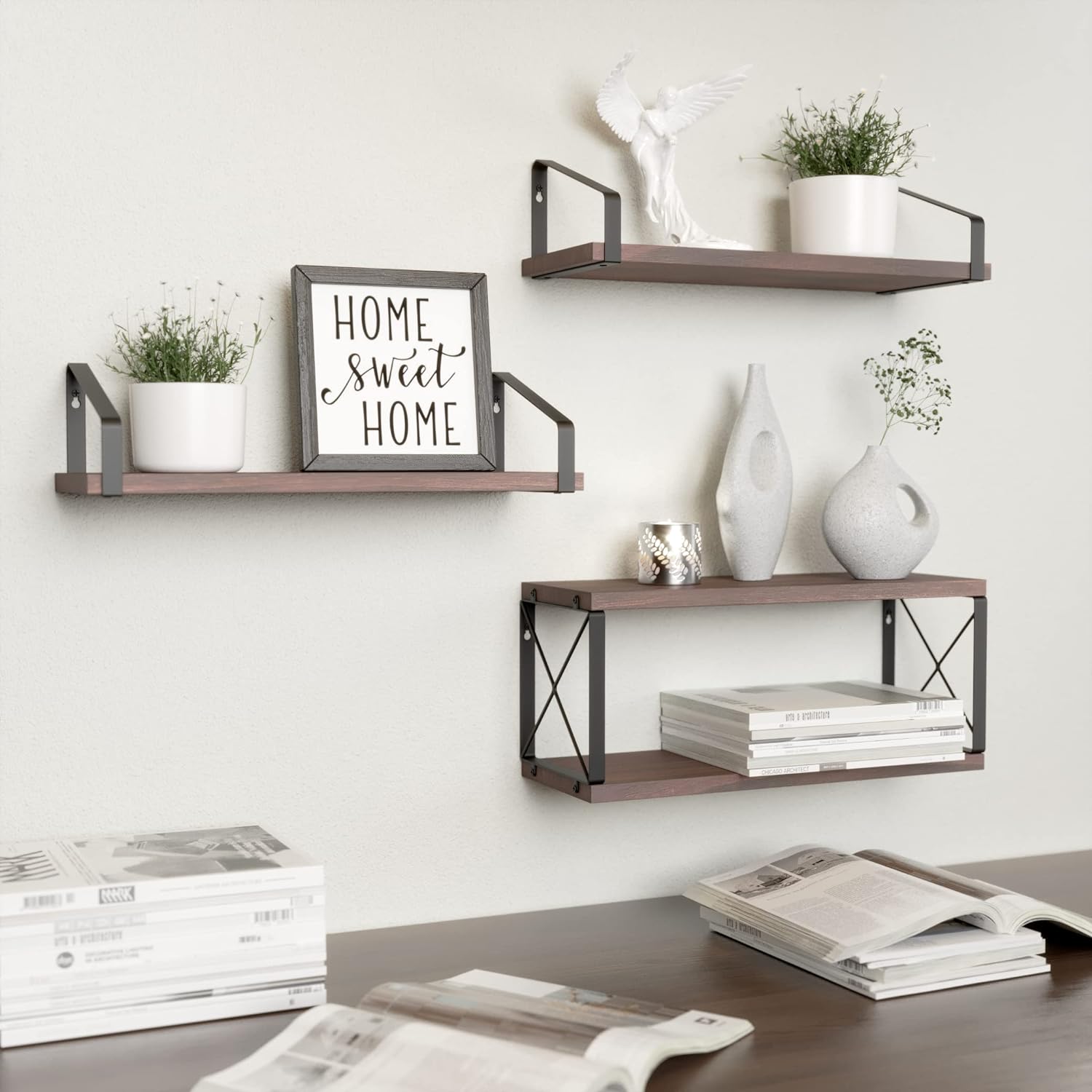 2-in-1 Wall Mounted Floating Shelves Set of 3, Rustic Wood Shelves for Wall Decor, Rustic Brown