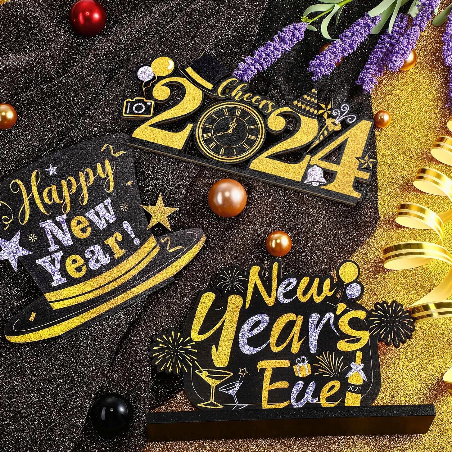 3 Pieces Happy New Year Table Decorations 2024 Wooden Table Centerpieces Ornaments Sign