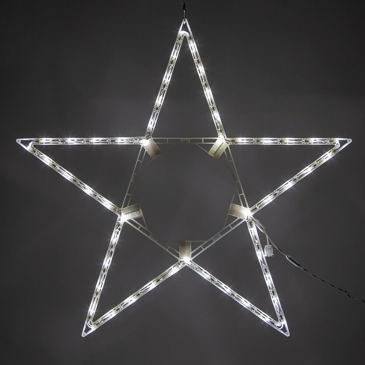- Bright 32” star decoration with 50 cool white LED mini lights strapped to a sturdy fold-flat frame