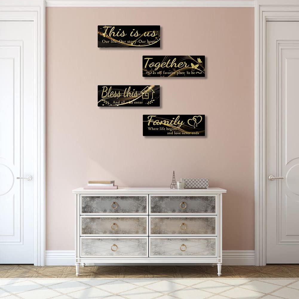 4 PCS Home Wall Decor Signs,Rustic Wooden Living Room (Black -1, 15 x 5.1 inch)