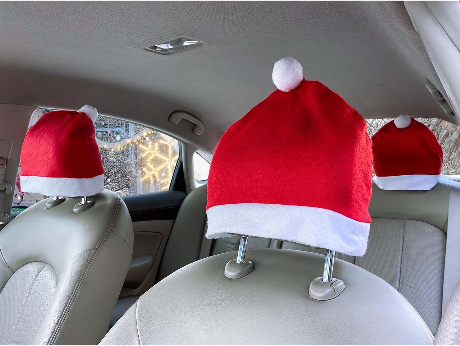- 【 Comfortable and humane】 : Our Christmas hat decoration meets road safety; Our holiday car Christmas decorations are durable and soft, providing comfort to the head; These can protect the hair from static electricity or frizz, and protect the headrest from scratches and other possible wear and tear; The bright colors of our Christmas hats add a festive atmosphere to the journey