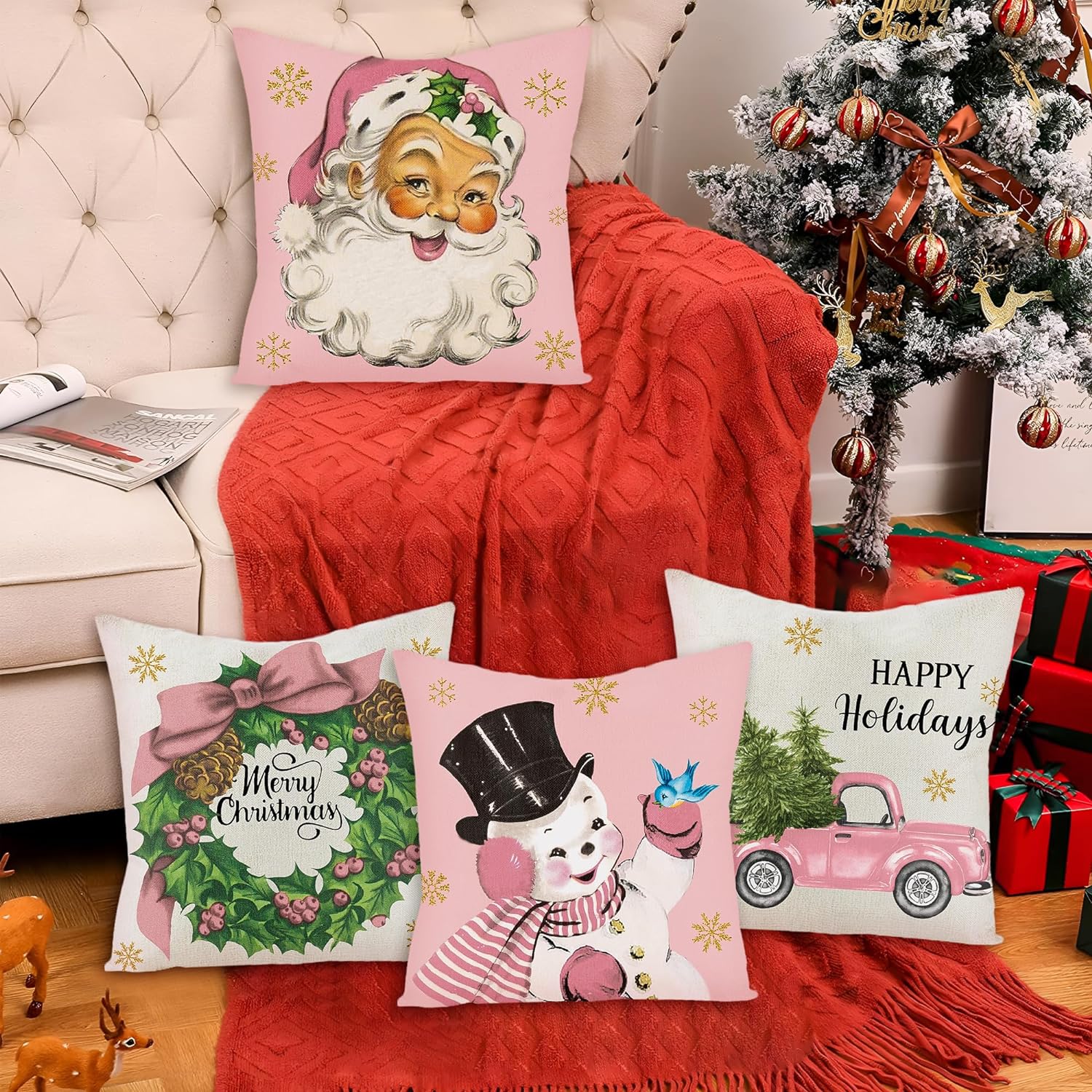 4Pcs Pink Santa Theme Party Christmas Decorations Pillow Covers, 16 x 16 inches