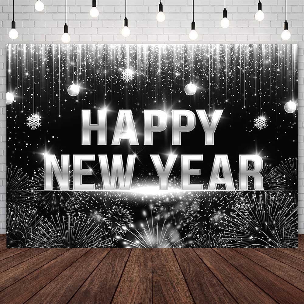 7x5ft Happy New Year Backdrop Black Silver Glitter Bokeh Fireworks Photography Background