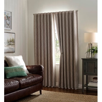 Add a contemporary touch to your space with the Allen + Roth 100% Blackout Rod Pocket Back Tab Window Curtain Panel. Beautifully designed with a jacquard print in charming colorways, this panel features a blackout liner for added privacy and noise reduction.