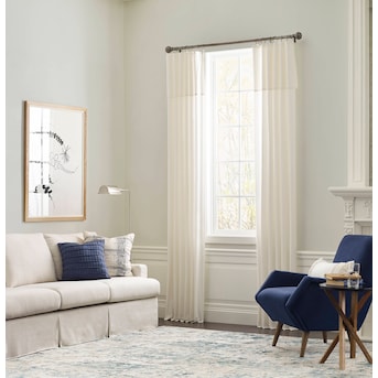 Take your window to the next level with the Allen + Roth Annalise Cloud Light Filtering Ring Top Window Curtain Panel. Made of 100% cotton solid chambray, this window curtain panel can be hung 3 ways, either with the included rings, with the rod pocket and valance, or with the rod pocket and no valance. Rings are oil-rubbed bronze colored and 1.5” in diameter. Imported from Pakistan. Machine Washable. Exclusively at Lowe’s.