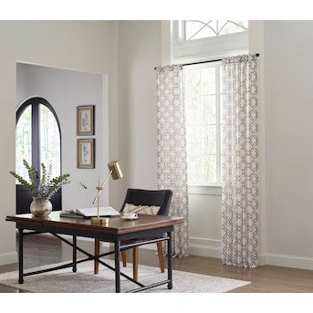 Elevate your window with the Allen + Roth Tilli Light Filtering Rod Pocket Back Tab Window Curtain Panel. Made of a 95% Polyester, 5% other fibers blend, this window curtain panel features a tonal lattice trellis print on textured slub yarns giving the curtain a beautiful woven look. Can be hung via the rod pocket or by using the back tabs. Curtain has a 3” Rod Pocket, curtain rod sold separately. Imported from China. Machine Washable. Exclusively at Lowe’s.