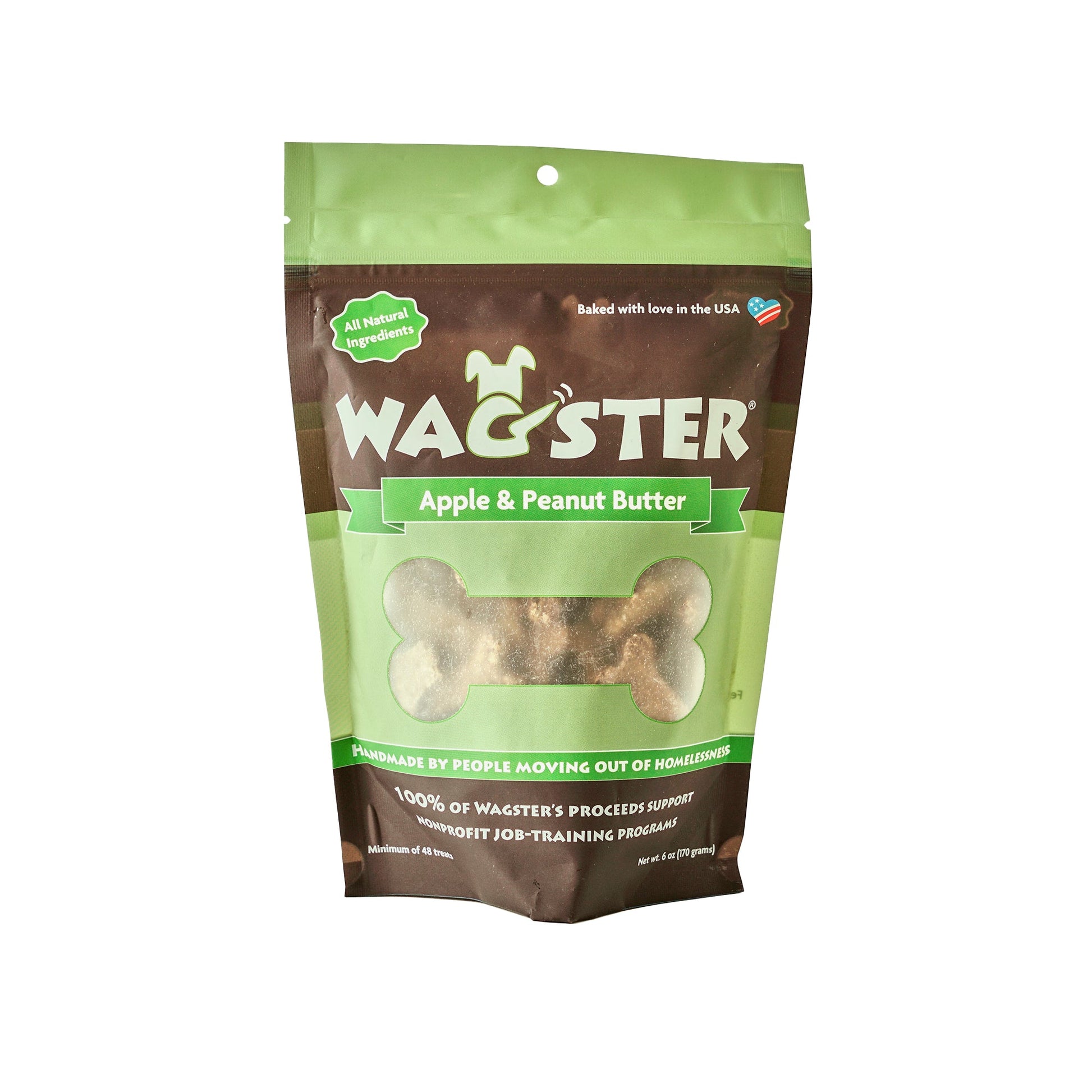 Like all dog treats from Wagster, the Apple & Peanut Butter recipe is vegan and free of gluten, corn, and soy.