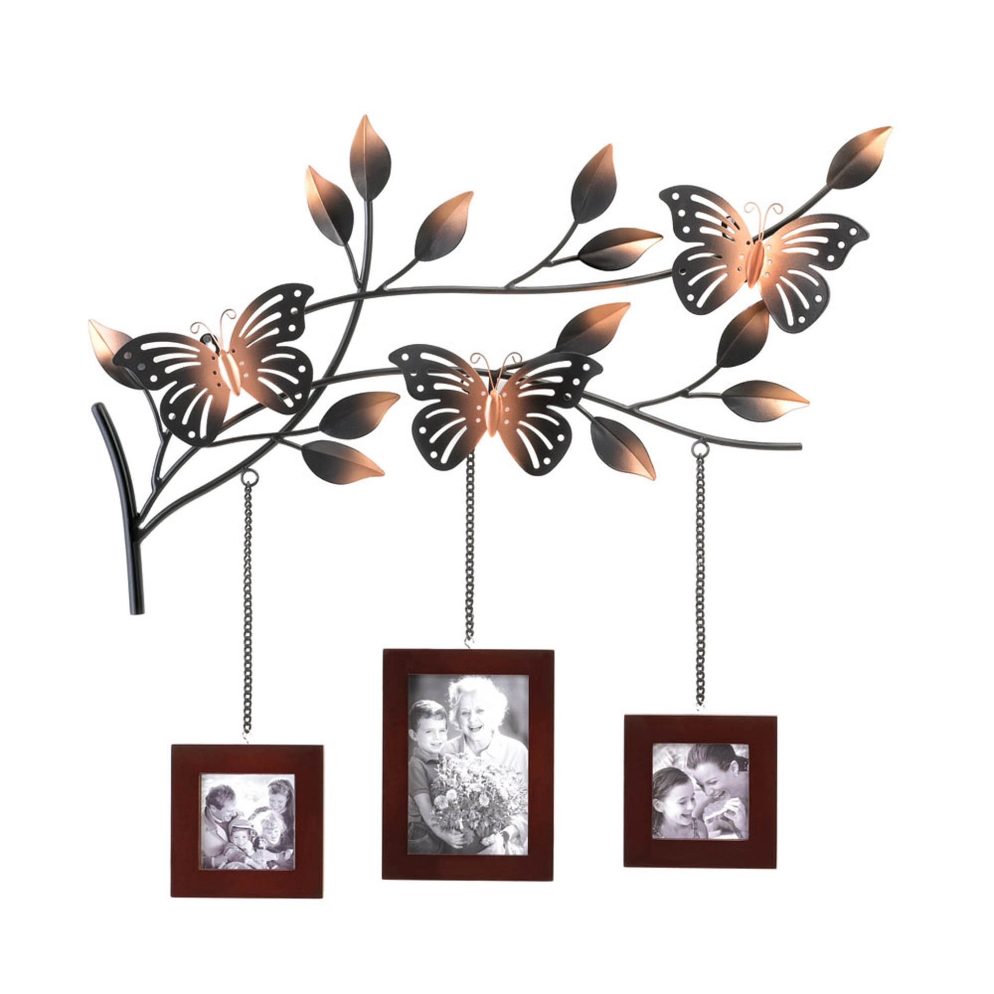 - The most lovely way to display three of your favorite family photos! A trio of wood picture frames hang from a metallic branch blooming with leaves and home to three gorgeously detailed butterflies. This fabulous wall décor will turn your favorite photo memories into an absolutely stunning focal point. Fits two 2.5 inch by 2.5 inch and one 3.5 inch by 5 inch photos.