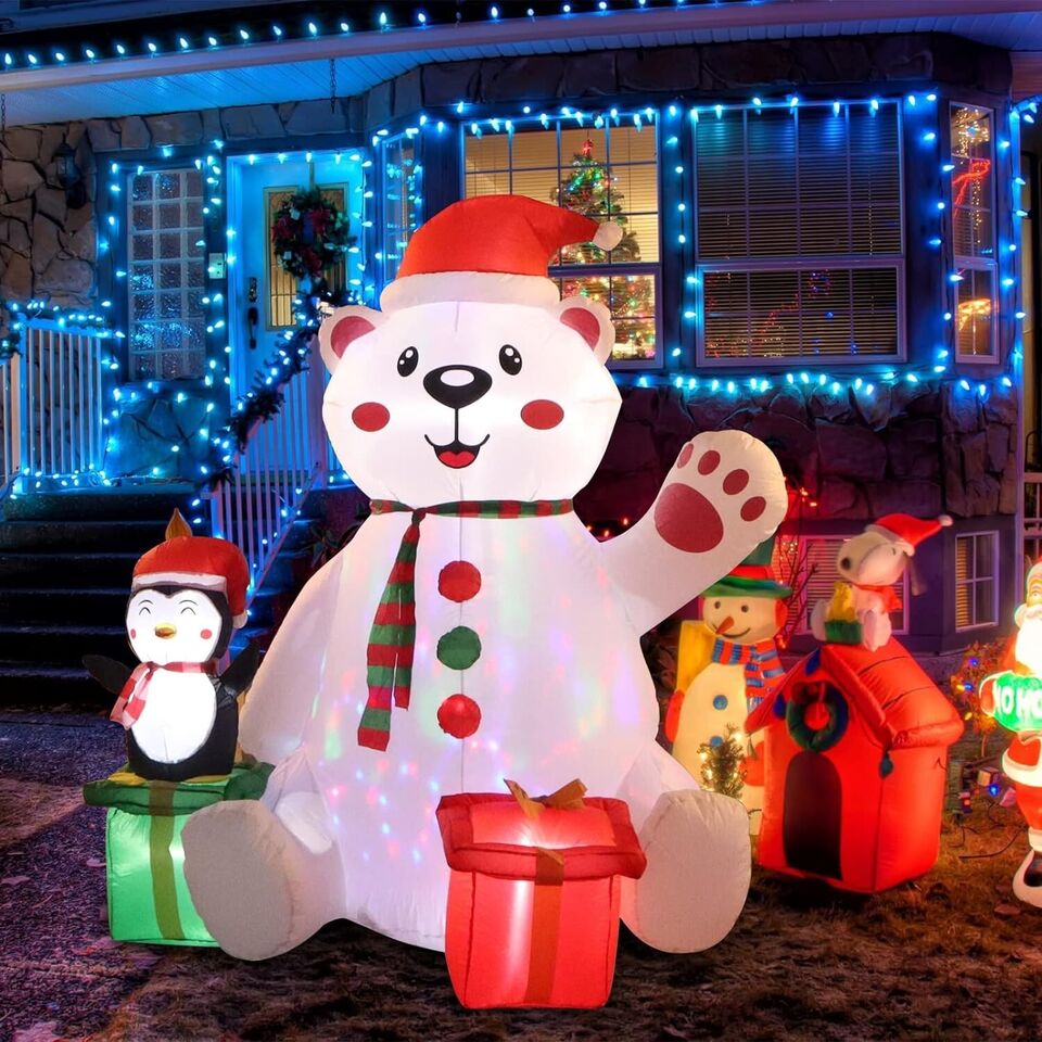 - 🐻Adorable Polar Bear Inflatables with Lights : The outdoor Christmas inflatables combine a tall and cute white polar bear with scarf and Christmas hat on, 1 small and lovely penguin and 2 red and green gift boxes. The inflatable Christmas comes with multiple LED colored lights which creates better festival atmosphere especially at night. The polar bear and penguin glow in the dark are much more attractive.
