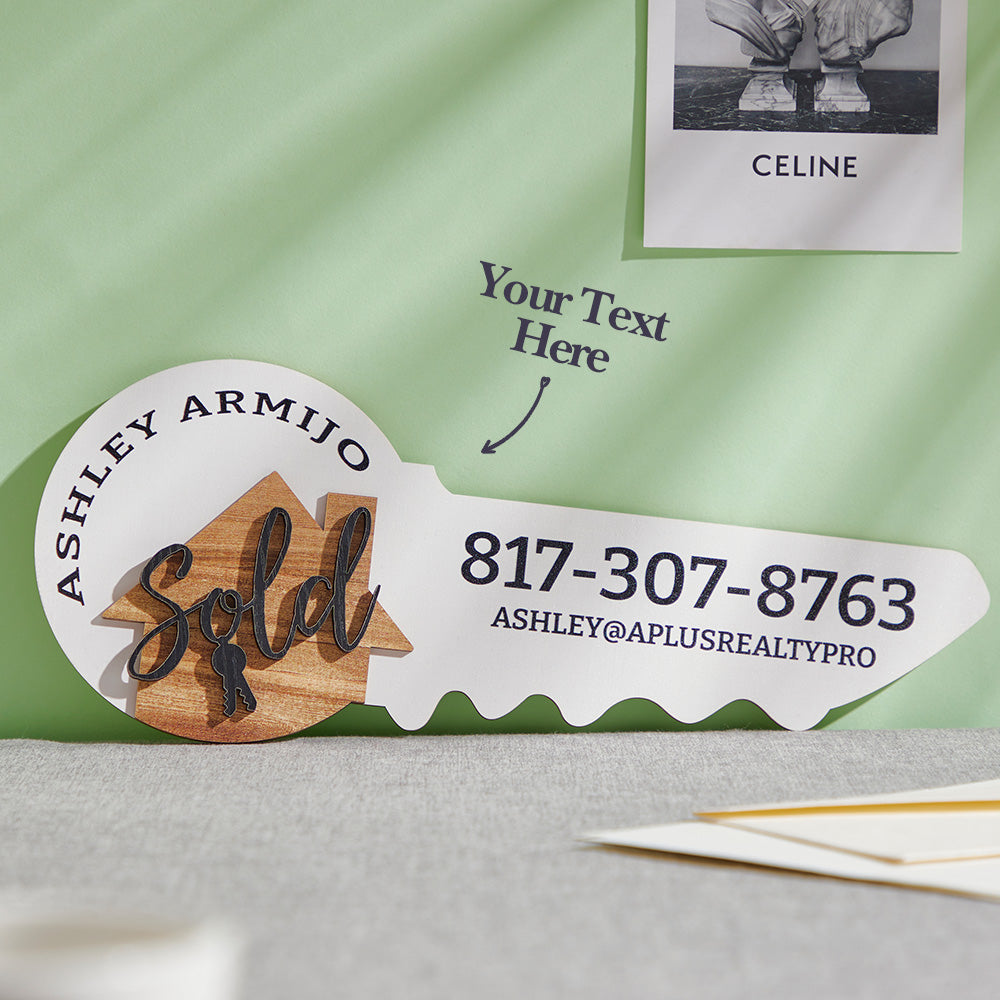 Social media is very important nowadays to promote your Real Estate Business. Did you know that photos with props get more interaction than photos without props?Ready to Order?Include the name or text you'd like to appear on the right-hand side of the key (Example: Your Name, Your phone number, Your Website).In the demo picture is a LARGE sign with a raised natural wood house, and gold writing.