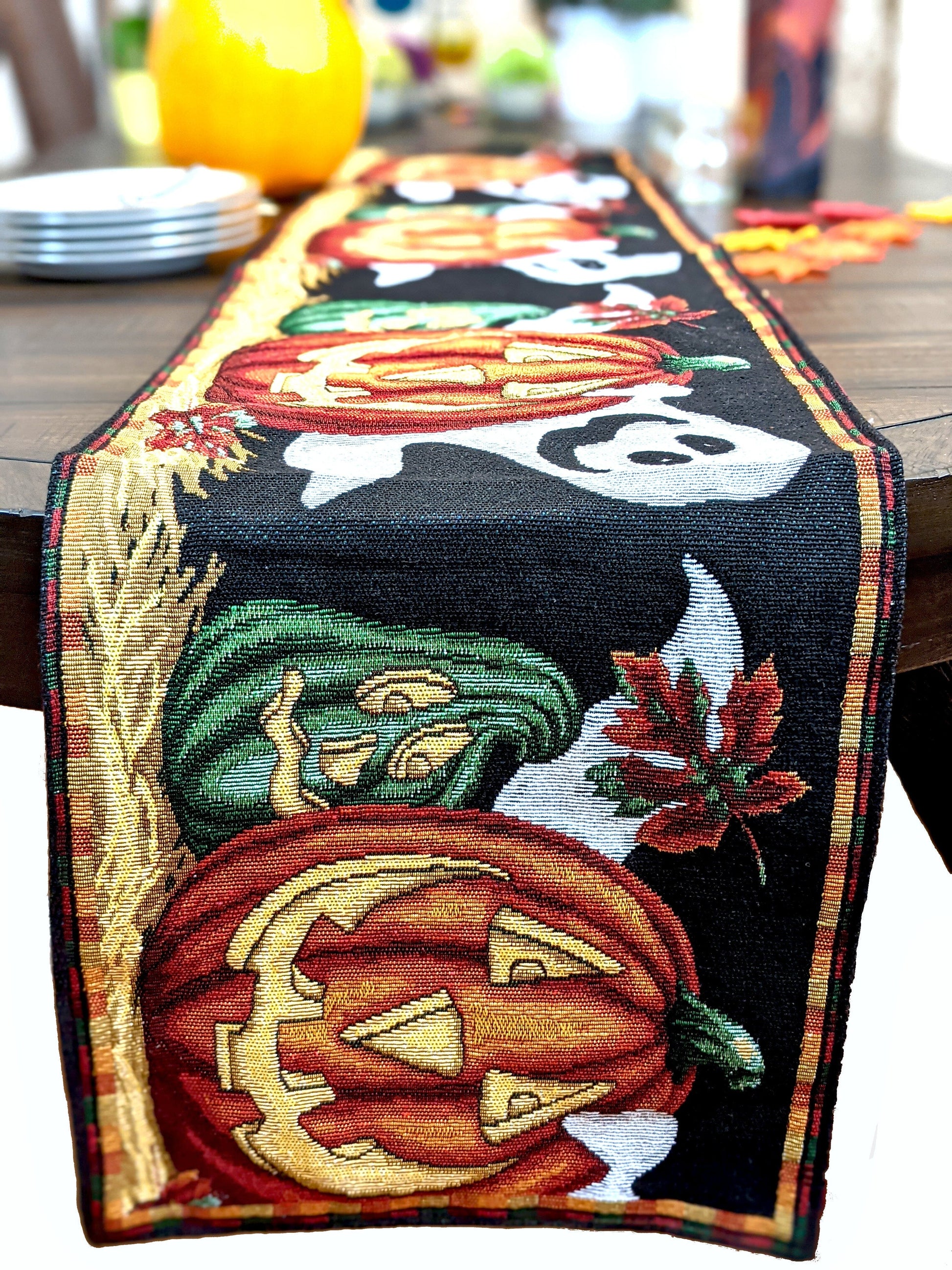 Spooky Jack-o’-lanterns, ghosts, and fall leaves decorate our one of a kind DaDa Bedding table runners.