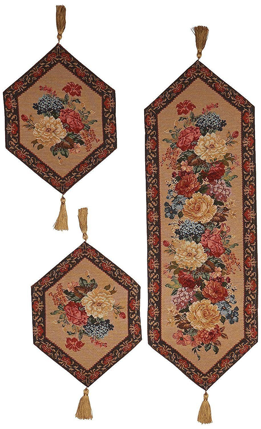 DaDa Bedding Set of 3-Pieces - Breath of Spring Floral Beige Woven Dining Tapestry Table Runners (3089)