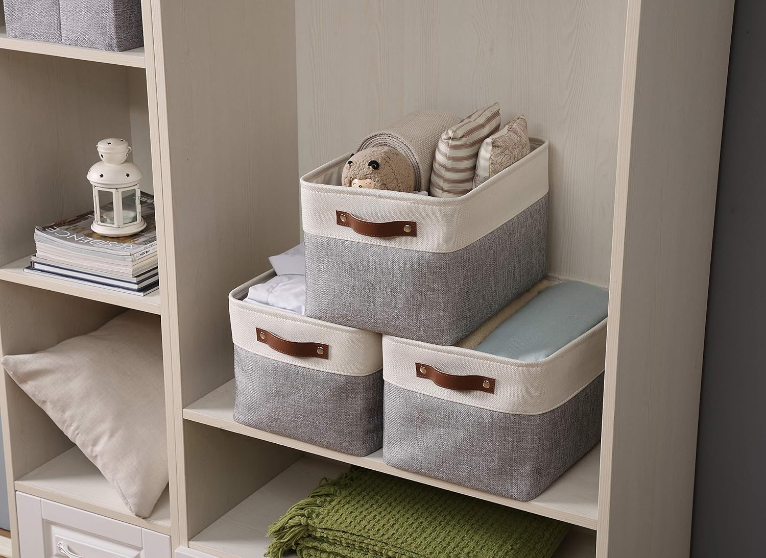 Decorative Large Linen Closet Organizer Bins with Handles (Grey and White, Large - 3 Pack)