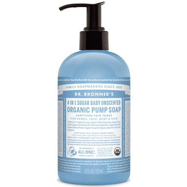 Dr. Bronner's 4-in-1 Sugar Baby Unscented Organic Pump Soap is certified by the same National Organic Program that certifies food. Our pump soaps are smooth and luxurious with no synthetic detergents or preservatives. Sweet to the body and planet! Fair trade & organic sugar gives our Organic Pump Soaps a rich caramel color and sweet scent. The sugar combines with organic white grape juice to keep your skin nourished, hydrated and smooth. Organic coconut-olive-hemp oils blend for a creamy castile lather – our soapmaking tradition!