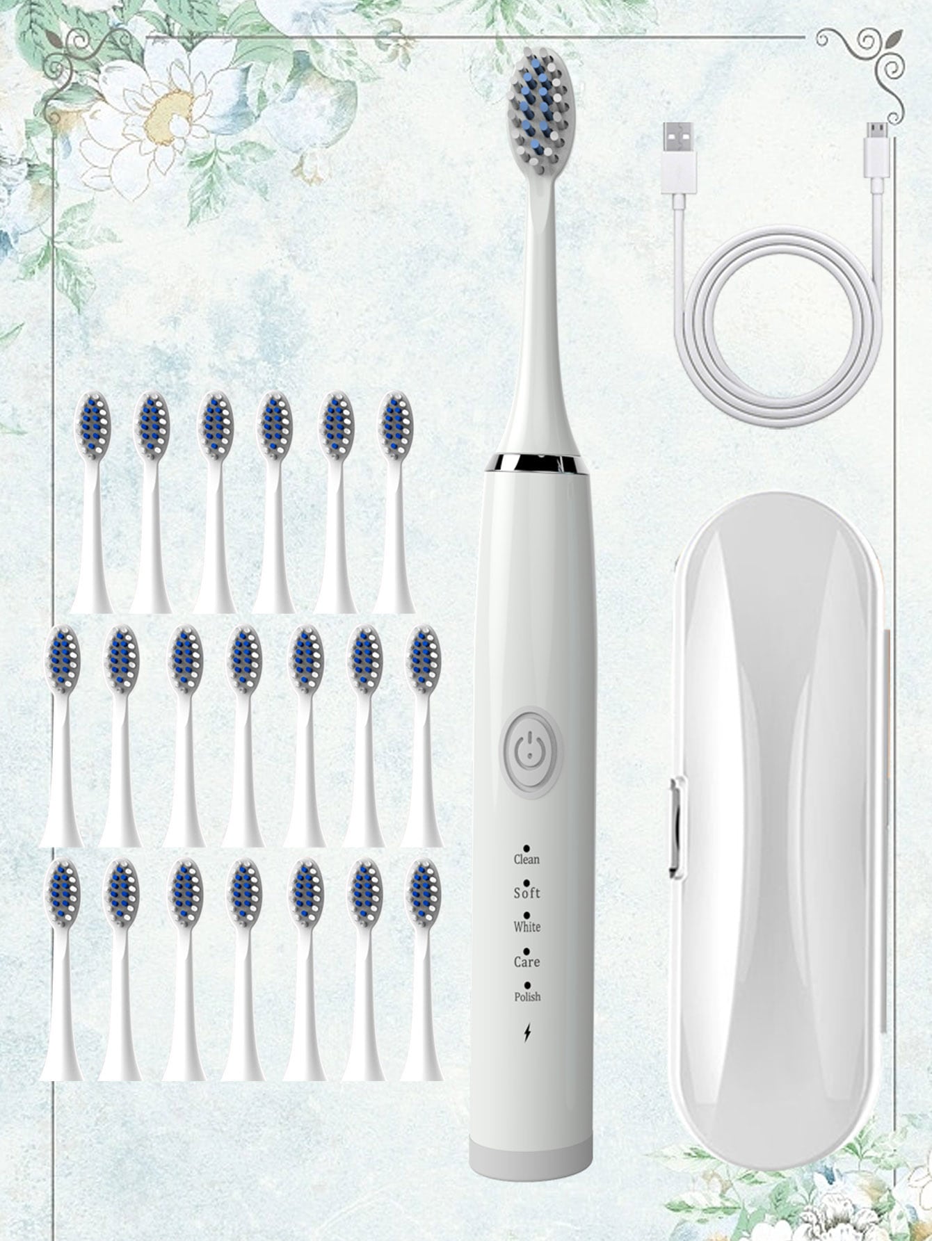 Achieve a brighter, healthier smile with our Electric Toothbrush for Adults. This model comes with a convenient charging-e white travel case and an impressive 21 brush heads, making it perfect for home use or on-the-go. The soft S replaceable heads are gentle on teeth and gums while the waterproof IPX7 design ensures easy cleaning and maintenance. With one-button control for intelligent teeth cleaning, this toothbrush is perfect for both men and women looking to care for their dental health. The rechargeable power supply means you'll never have to worry about replacing batteries. Plus, with CE certification, you can trust in the quality of our product. Say goodbye to manual brushing and hello to a brighter smile with our Electric Toothbrush for Adults.