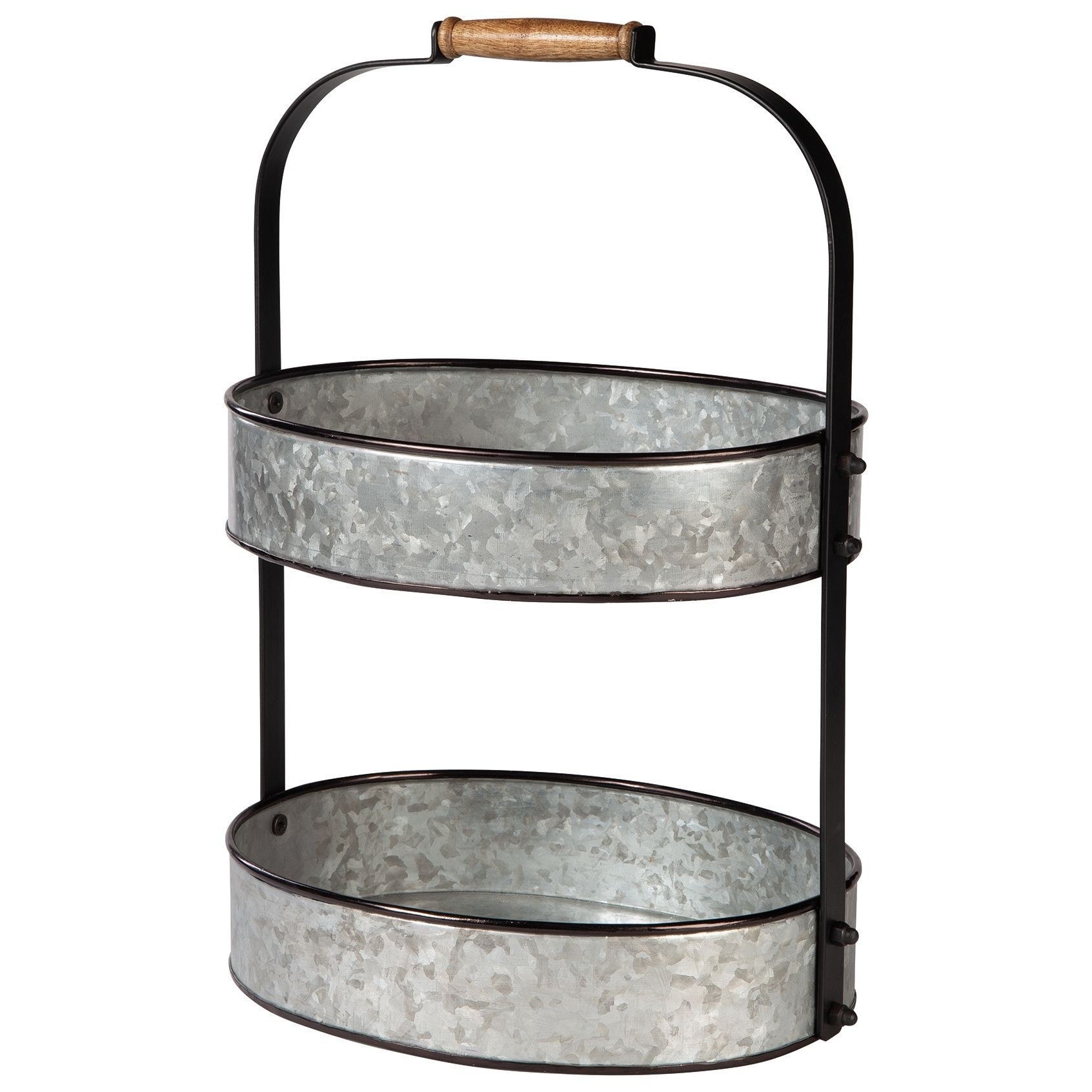 This two-tiered tray is waiting for you to create a personalized vignette. Designed with two metal tiers and wooden handle for easy transport, it's ready as a centerpiece when you entertain or corral your keys when the party's over. Its French countryside style is perfect in the entryway, bedroom or gracing your dining or living room table.