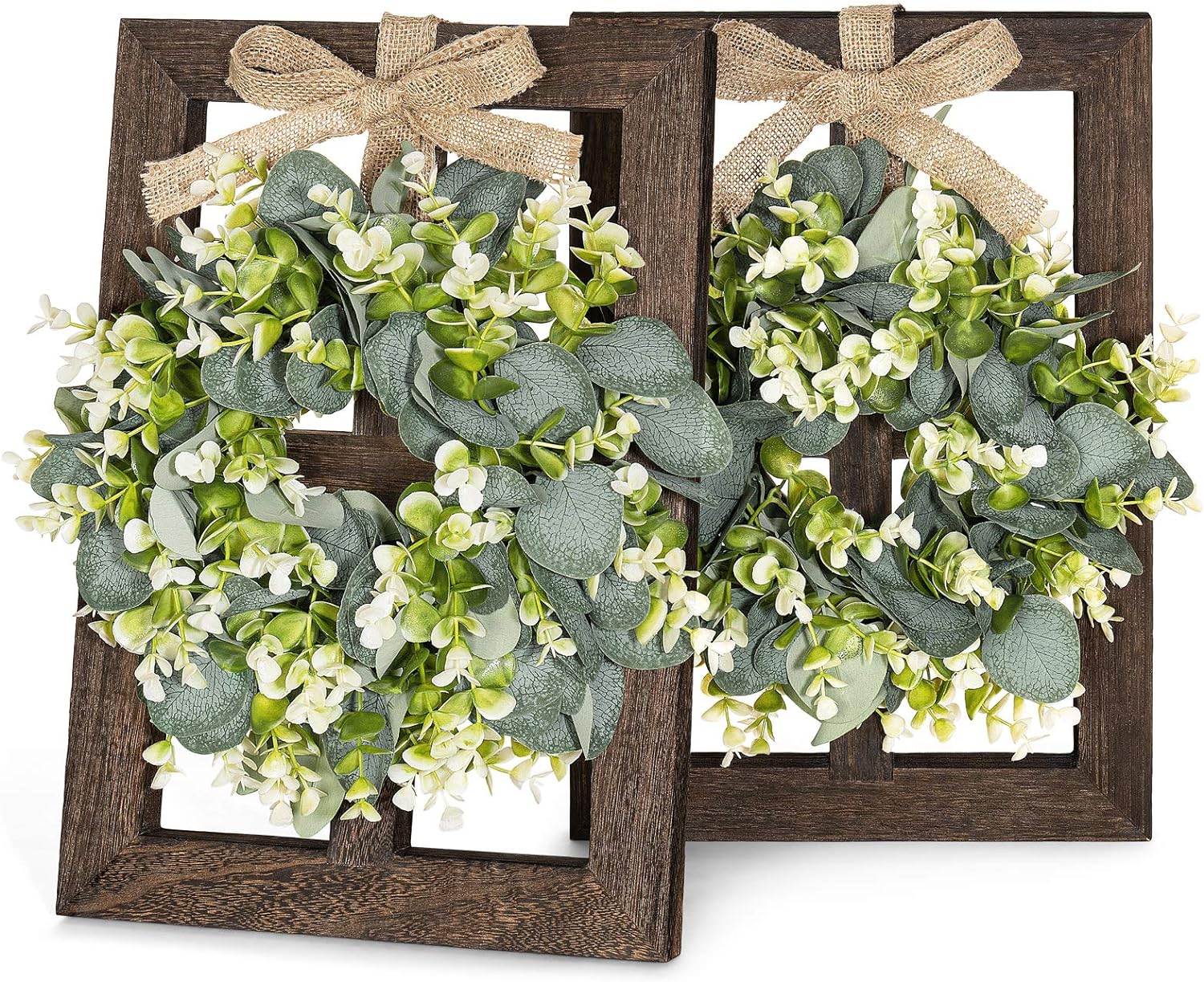 Farmhouse Wall Decor Window Frames with Eucalyptus Wreath, 2 Pack, 16 X 11 Inch, Brown