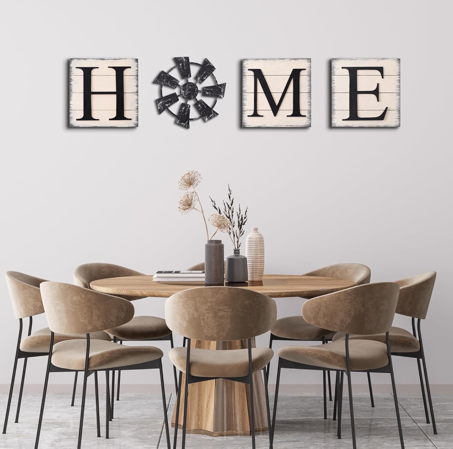 "Transform your space with our charming farmhouse decor wall sign featuring the letters 'H', 'M', 'E', crafted from high-quality wood, and adorned with a whimsical metal windmill for the 'O'. These rustic farmhouse wall decor signs add a cozy warmth to your home, while their eye-catching design is sure to surprise and delight your guests.