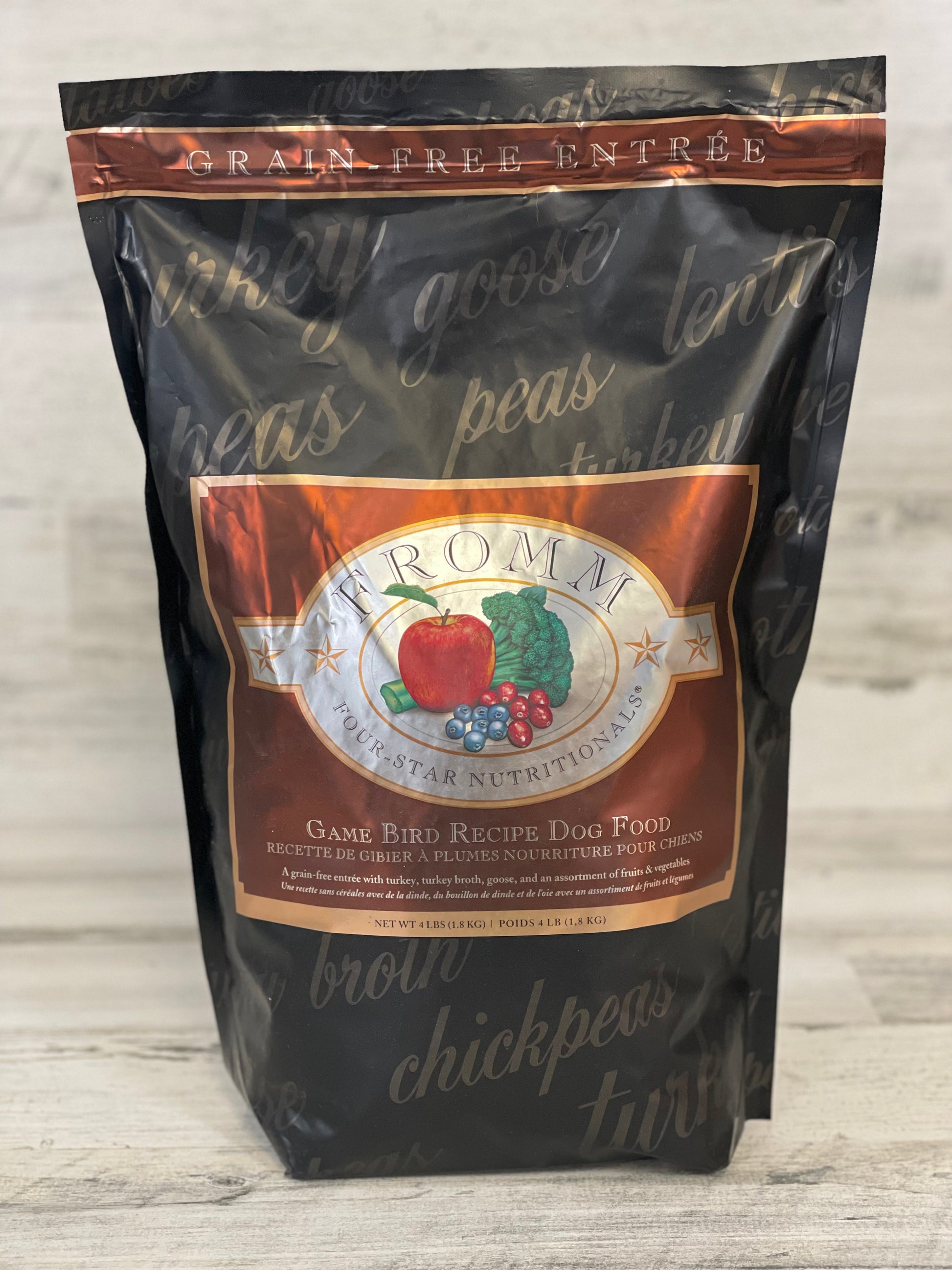 Fromm Four Star Grain Free Game Bird Recipe Dry Dog Food is made with a hearty blend of Duck, Turkey, Quail and Pheasant then mixed with the freshest broccoli, cauliflower, apples and spinach for a taste that can't be denied. Fromm is made with prebiotics and probiotics for added digestion aid. This formula is completely grain free and made right here in the USA! Fromm dry foods are appropriate for all life stages feeding.