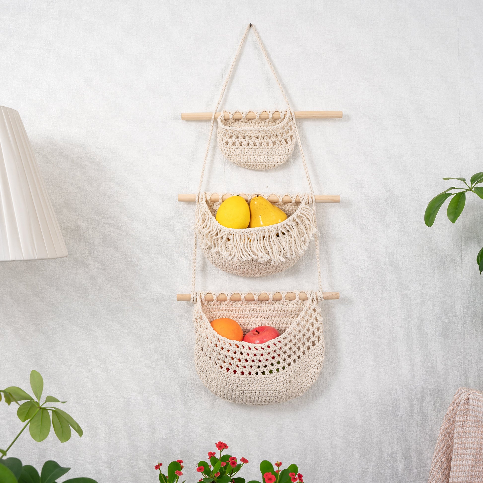 This macrame wall hanging is the perfect solution for organizing your fruits and vegetables. Made of high-quality cotton, it's great for storing onions, potatoes, and other produce. The wall hanging features three bags that can be used separately for additional storage options.