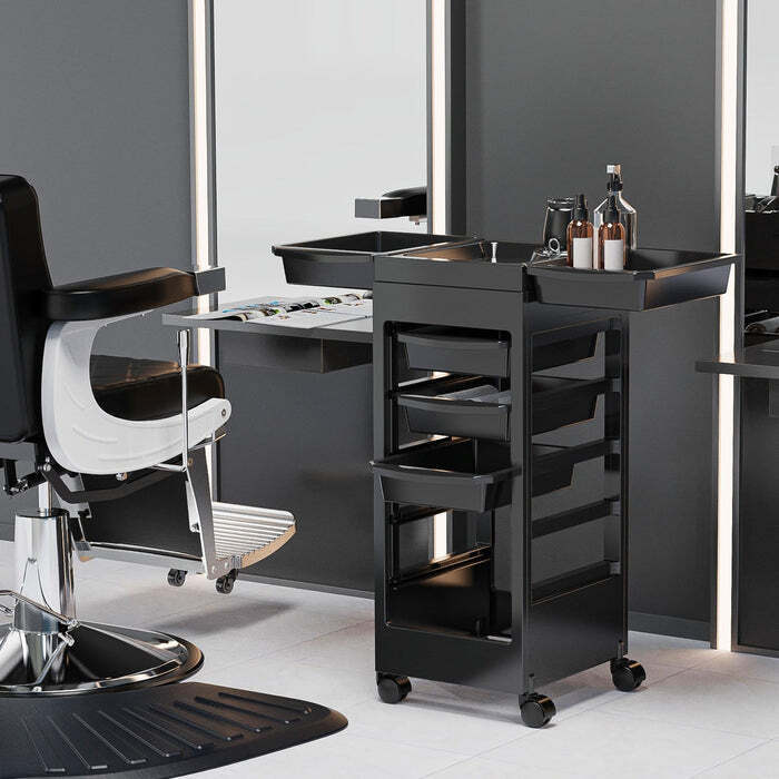 Expandable Top Workbench: Our salon cart features removable drawers that can be conveniently attached to the top for easy access. Designed with a built-in holder for a hairdryer and three small openings for shears and combs, it's perfect for beauty salons, barbershops, spas, tattoo parlors, nail salons, and grooming shops.
