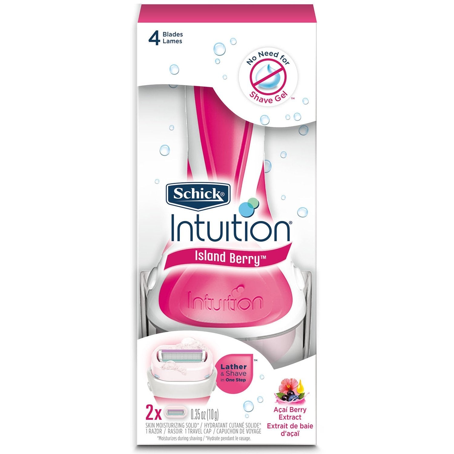 Details: Lather and Shave in One Step. No Need for Shave Gel. Looking for a shaving and skin care routine without all the hassle? Schick Intuition puts the shave cream right on the razor! It's the first and only razor that lets you lather and moisturize during shaving in one easy step! No need for soap, shave gel or body wash. The Schick Intuition Island Berry razor is formulated with Acai Berry extracts for a smooth shave. It also features a 4-blade pivoting head to glide smoothly along the contours of your legs and body. Our Skin Conditioning Solid moisturizes dry skin during shaving and will leave skin feeling smooth. Schick Intuition is the simple way to get smooth, beautiful legs. Schick Intuition Island Berry refills each contain 4 blades surrounded by our unique skin conditioning solid that lathers and moisturizes during shaving. Try our 3 ct. or 6 ct. refills in Pure Nourishment, Sensitive, or Revitalizing Moisture.