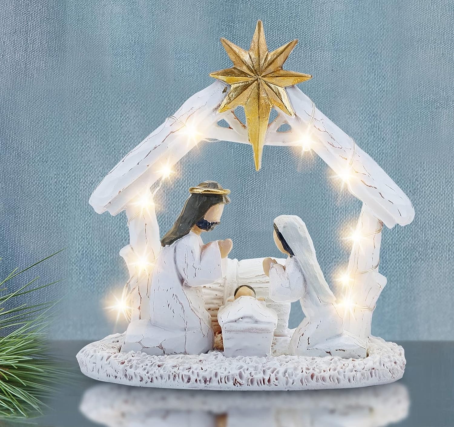 Nativity: This Christmas nativity playset includes four essential pieces: a star adorned with LED string lights, figurines of Joseph, Mary, and the baby Jesus in the manger. All the elements are thoughtfully crafted to help you recreate the beautiful and timeless story of the Nativity.