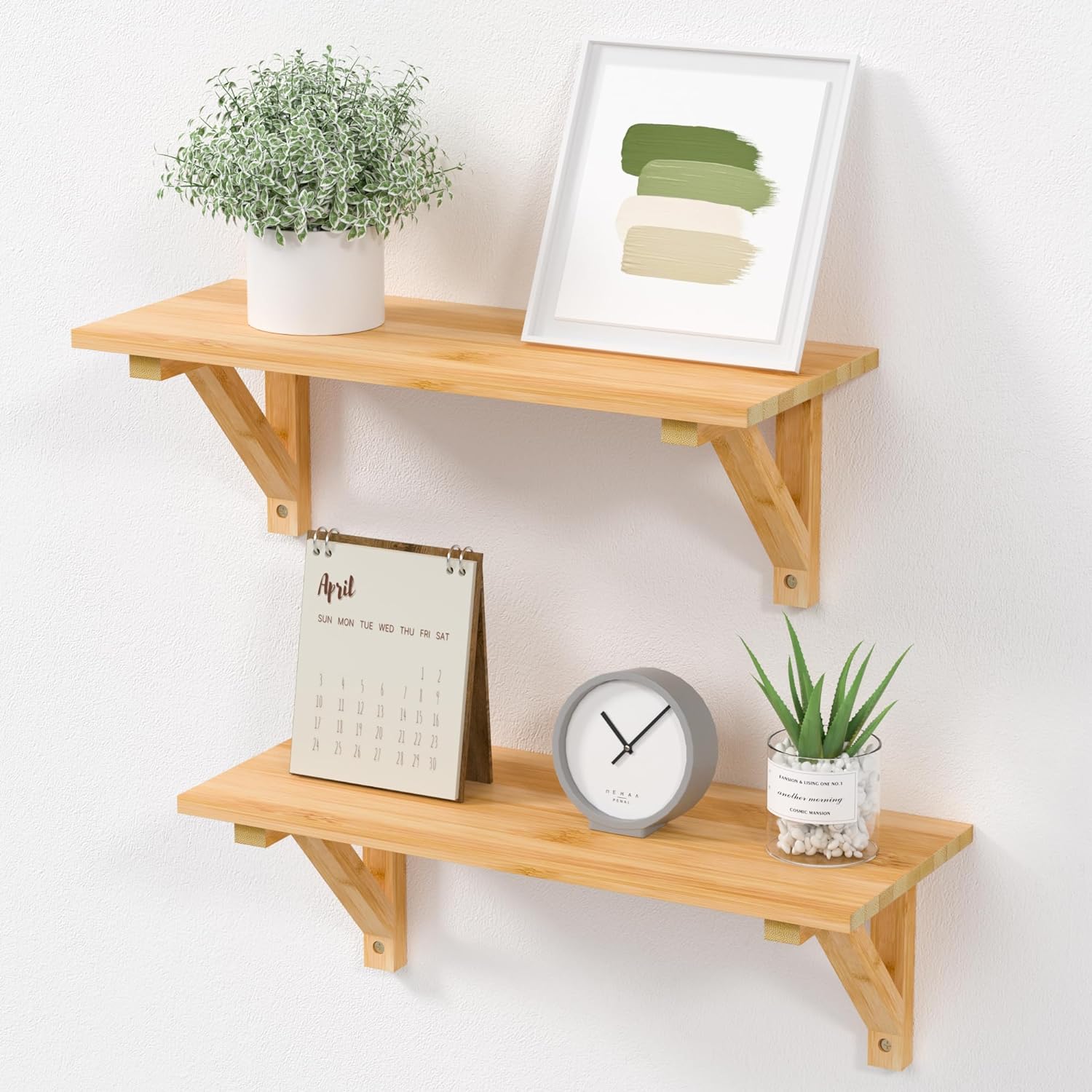 Set of 2 Hanging Wall Shelf, Rustic Wood Shelves for Bedroom (Bamboo)