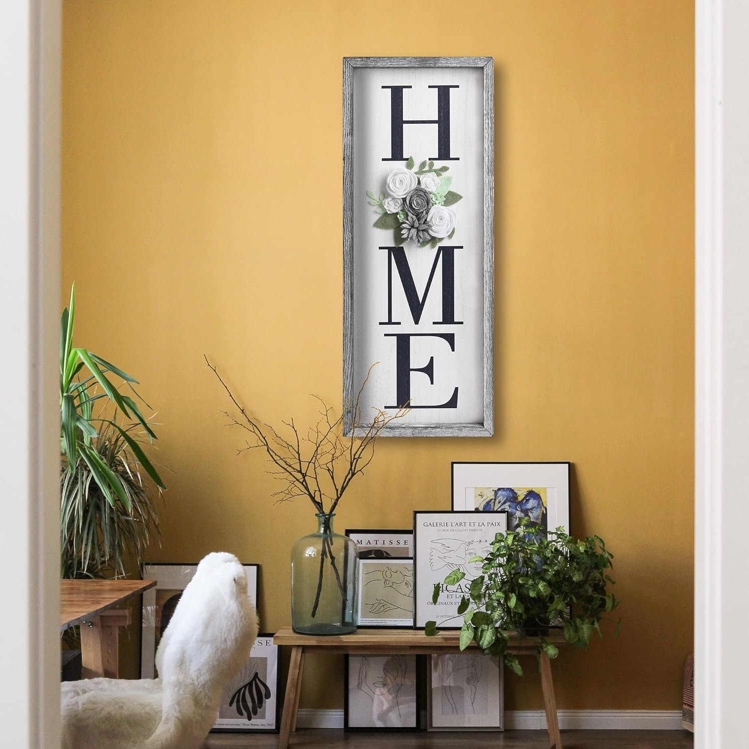 Vertical HOME Sign with Felt Flower, Gallery Wall Art,Home Plaque Wall Hanging Sign 21.7x8.6, Rustic Grey