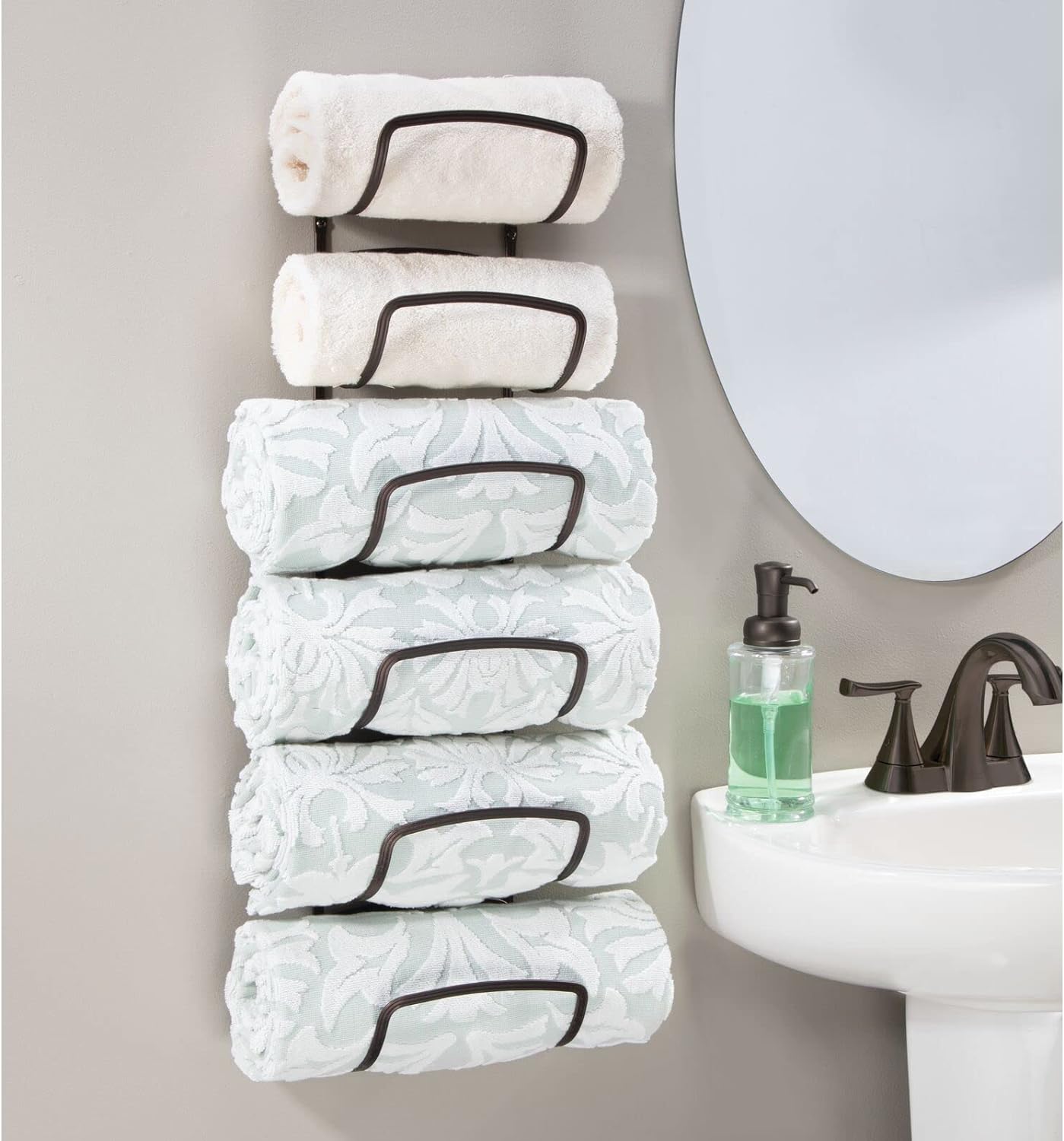 - 6 TIER STORAGE: The six vertical arms of this bathroom organizer and towel holder hold and store small towels; The open design makes grabbing a towel quick and easy when your hands are wet; The stylish curves of the wall mount towel storage add a decorative touch to bathroom decor