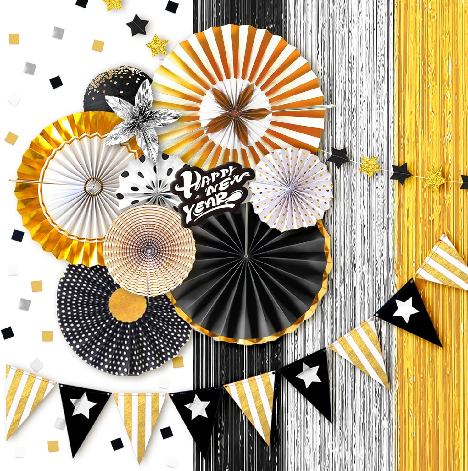 Comprehensive Pack: Detail the contents of the pack, which includes 8 hanging paper fans, 2 fringe shiny curtains, 1 triangular pennants banner, 1 star paper garland, 1 paper lantern, 1 sticker, and 1 confetti—all in coordinating black, gold, and white colors. This comprehensive set ensures a cohesive and visually appealing decoration theme.